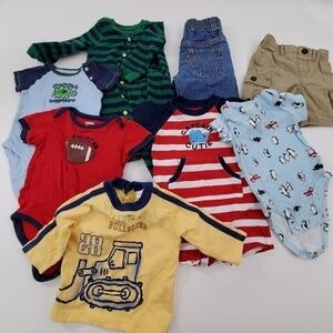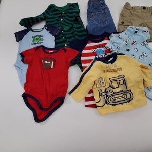carters 9 mo khaki shorts, levis 6 9 mo jeans, gymboree red 6 12 mo one piece, just one year 6m yellow shirt, carters 6 mo blue one piece, carters 6 m penguin one piece (stains), just one you 6m red stripe, gap 6 12 mo green stripe