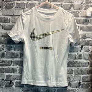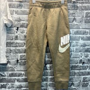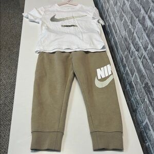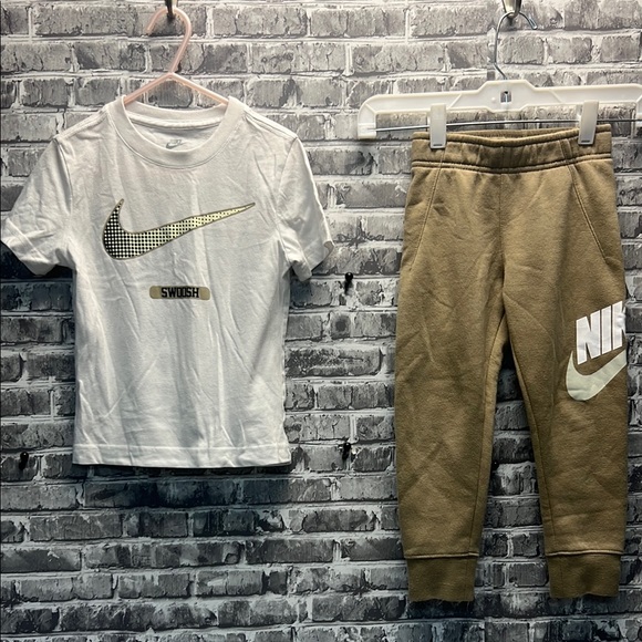 Experience ultimate comfort and style with Nike's set with tan sweatpants, designed for a relaxed fit and crafted from premium materials. These joggers are perfect for casual outings, offering a versatile look that pairs well with any wardrobe. Enjoy the signature Nike quality and attention to detail in every stitch. White pullover T-shirt. Used but in good condition. Size 4.