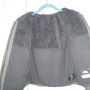 Preowned hooded boy's North Face jacket. Size Large (14/16.) Grey with black exterior. Down filled with partial fleece lining. No rips, tears, or stains. Smoke free home.