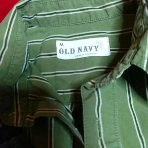 Old Navy button down green with darker green and white vertical stripe dress shirt.