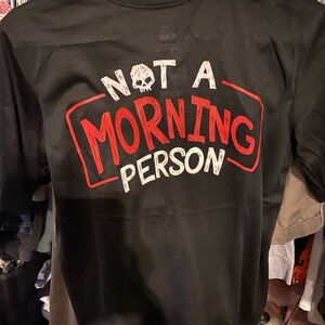 Bacon and eggs skull pajama top. Says not a morning person. It’s new but has been in storage and the tissue paper that was protecting the front decal has stuck a bit. This will simply come off in the wash. This is a PJ tee but can easily be worn as a regular tee. Skull glows in the dark. Boys XL.