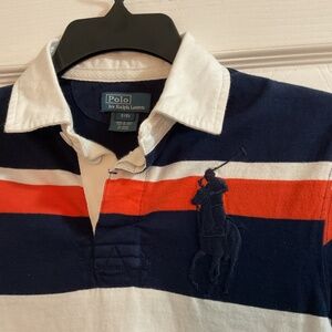 Start them out young with this timeless classic! Embroidered big pony front logo makes this particular shirt extra special.White with navy blue and orange stripes. 2 button closure. Boys Size Small (8)