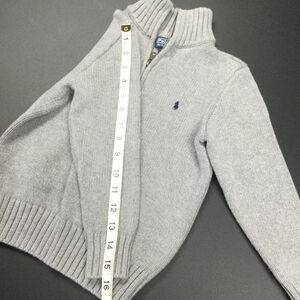 Pre-owned Polo by Ralph Lauren boys' size 6 quarter-zip sweater in gray. The sweater is made of 100% cotton and features ribbed collar, cuffs, and hem. It has an embroidered pony logo on the chest. Measurements are approximately 17" length, 16" sleeve length. The sweater is in excellent condition with no visible imperfections.