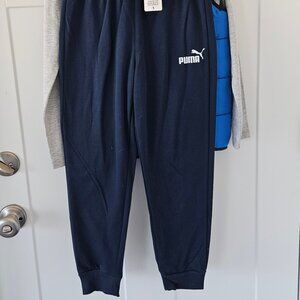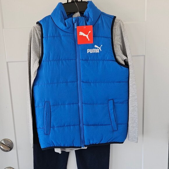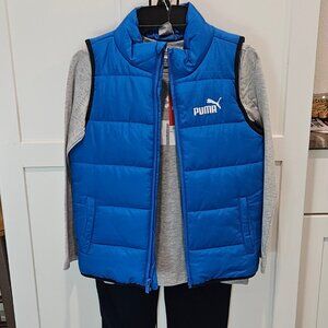this is a boys size small 3 peice set. New With Tags. It includes long sleeve grey tee shirt, royal blue vest and navy blue pants, all with the Puma logo. Vest has a zipper front and two side pockets, and navy blue piping.. Pants have an elastic waist and elastic cuff. Pants and top are 50% cotton and 40% poly. 3 peices to mix an match with other things!
