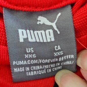 This is a boys Puma 3 peice set, sweat pants, long sleeve tee shirt and vest. all have the Puma logo. Tee shirt and pants are 50% cotton and 40% poly. Vest has a front zipper and two front pockets. Size is XXS which translates to a toddler size 3-4. Dark grey pants measure 24" long with an elastic waist and cuffs, Vest is black 19" long from top of collar to bottom and has a red embroidered logo to match the red tee shirt. all these peices can be mixed with others to make multiple outfits! perfect for fall!