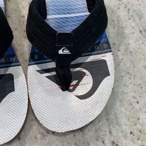 Boys or unisex flip flops. Straps are black faux suede. Red, blue and white soles. Some signs of normal wear including a slight dent on the side. Please see images. Size 4.