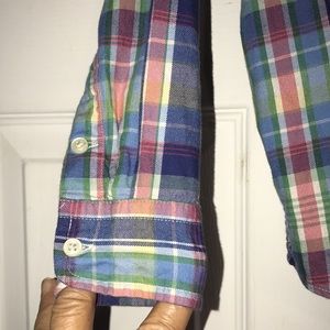 Little boy’s 100% soft cotton Polo shirt. Collared, buttons down. Plaid pattern of blues, green, & red. Navy blue logo on left chest. Buttoned wrist cuffs. Single pleat in back. In excellent condition. Sz 5.