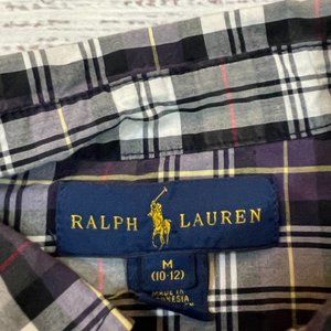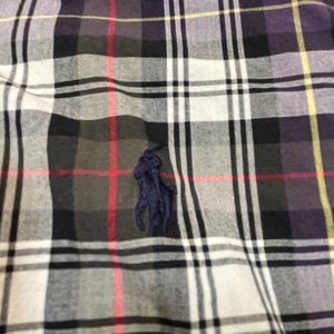 Classic meets cute in this Ralph Lauren Button Up Long Sleeve Shirt. Features Black/White/Purple/Grey/Red allover windowpane plaid with button front, button collar, pleated back and embroidered iconic Ralph Lauren branding at left chest