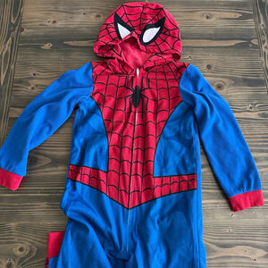 Let your little hero stay cozy and safe in this boys’ hooded one-piece pajama suit, size Medium. Featuring a vibrant red and blue design, the suit includes a hood with a character mask, a front zipper closure, and a flame-resistant polyester construction. Web-pattern and spider-inspired details add playful superhero flair, perfect for bedtime or lounging.