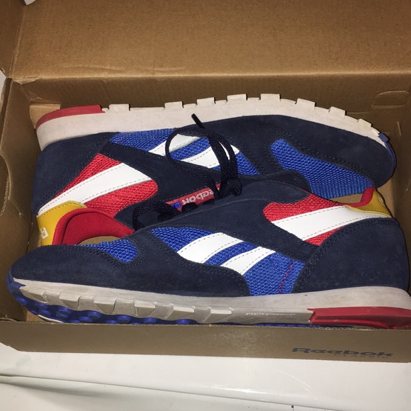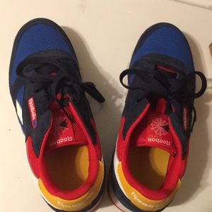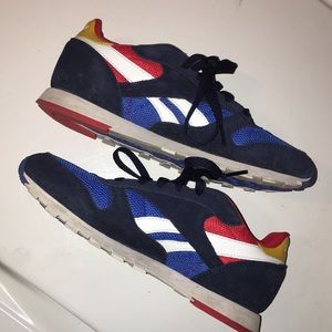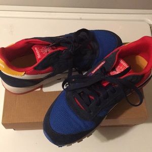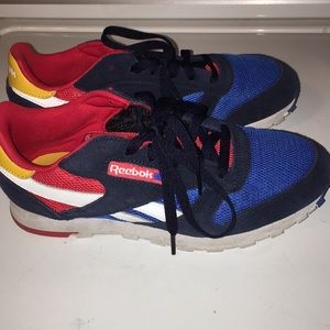 Red/navy blue/royal blue/white Reebok’s worn maybe 2/3 times. Still in great condition. Size 4