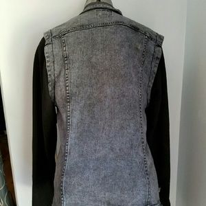 Boys Rude Denim Jean Jacket With Cloth Sleeves. The denim is distressed.