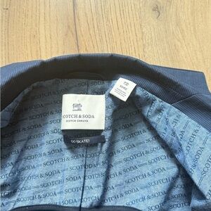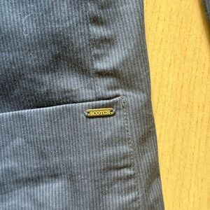 Navy blue with slight tone on tone pinstripe. Smoke and damage free. Only worn a handful of times.