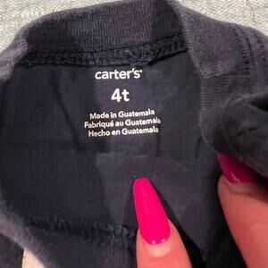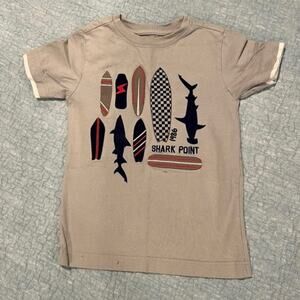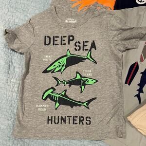 This is a Boys size 4 Bundle. It includes a Carter's Size 4T navy blue whale t-shirt, an OshKosh Size 4 Deep Sea Hunters t-shirt, a pair of Gymboree Size 4 khaki shorts, a Carter's Size 4T gray t-shirt with an orange crab and a Gymboree Size 4 shark and surfboard t-shirt. All are gently used, in good condition. There is one small stain on one of the surfboards on the last t-shirt pictured. Please see pics.