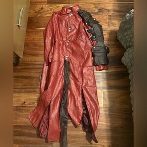 -The jumpsuit features a shiny black and red exterior and fiberfill padding to bulk up for a muscled look.