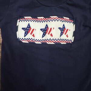 Boys' navy tee from Delaney with smocked patriotic stars. Perfect for 4th of July and other patriotic occasions. Great condition, size 9 months.