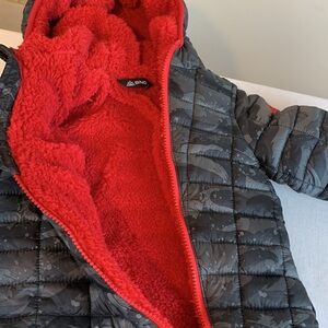 Red furry lining inside with mitten hands. Zipper front