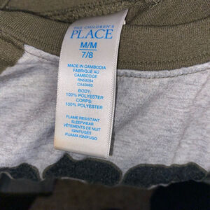 This is a The Children's Place t-shirt, size M/M (7/8). The shirt features a gray torso with a "BOSS MODE" graphic and a Jurassic World T-Rex Print. It has olive green raglan sleeves.