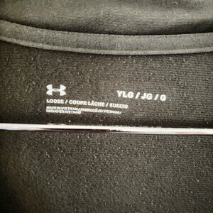 This pre-owned Under Amour jacket is perfect for the cool fall days. The color is gray with a black strap down the center of the sleeves. The closure is a full front zipper, there is a pocket of both sides of the zipper. Made from 100% polyester it is machine wash.