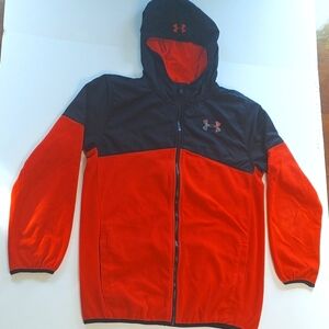 Soft fleece jacket with open side pockets, loose fit zip up style with hood, elasticized wrists, logo branding on top of hood and across back shoulders.