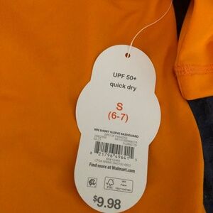 Boys Wonder Nation swim suits - 2 rash guards & matching swim trunks. Orange rash guard is new with tag. Size 6/7