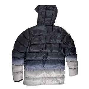Keep your kid warm and stylish with this Boys XL (approx. age 12) ombre puffer jacket. Featuring a gradient blue-to-gray design, this winter coat combines fashion and functionality. Made from 100% polyester with a full zip front, two zip pockets, and a cozy hood, it’s perfect for chilly days or snow adventures. Lightweight yet insulated for warmth and comfort.