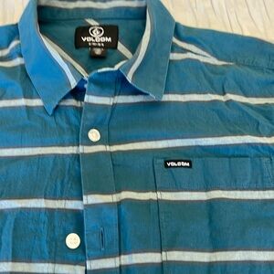 Teal blue Volcom size boys extra large striped button up short sleeve shirt brand new, probably never worn no rips no stains no tears from a pet freeze smoke-free home
