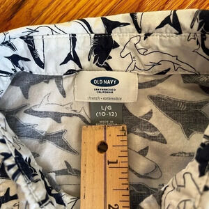 Boys button down shirt, size L (10-12). White and navy blue with shark 🦈 graphic. In excellent used condition, no rips tears or stains.
