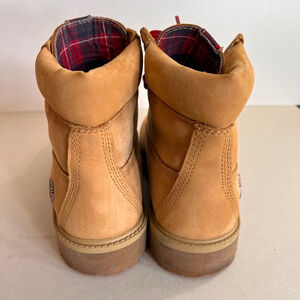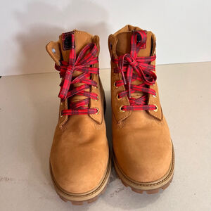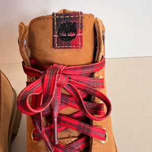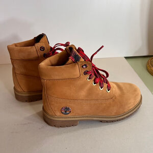 Pre-owned Timberland Premium Boots in Wheat Nubuck leather. Features red and black plaid laces and interior lining. All features are functional. In excellent used significant damage or defects are observed.
