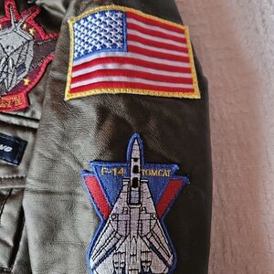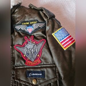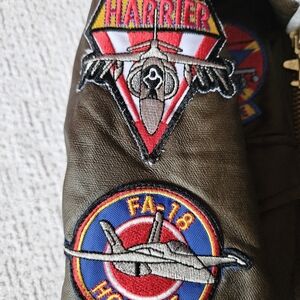 Flightless Airgear Boeing bomber jacket. Brown with patches and gold colored zipper. White/cream colored color. Milti colored lining.