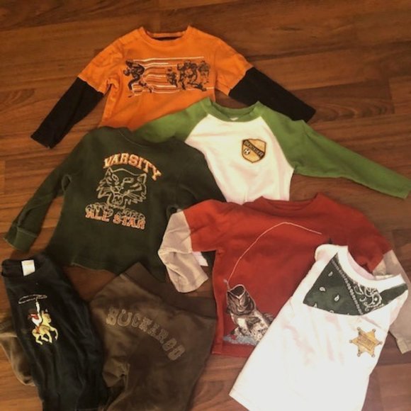 Includes 5 long sleeved tees, 1 PJ top and 1 adorable pair of sweatpants with 'buckaroo' stitched on the bottom. The sweatpants do have a tear in the knee which I tried to show in the picture.