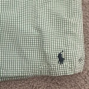 Stylish green checkered swim trunks. Ideal for beach or pool days.