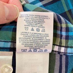 Boy’s Lands’ End blue and green plaid long sleeved button up dress shirt