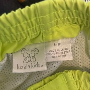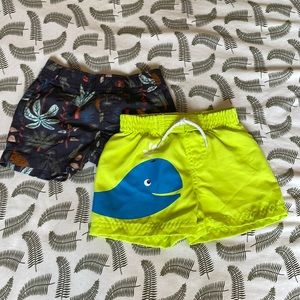 Two pairs of baby boys swim / summer shorts. Carter’s with dark blue jungle print are 100% cotton without mesh insert. (They might not actually be swim shorts but they look and feel like it.) Neon green pair with the whale are “Koala Kids” brand, 100% polyester with a mesh insert. Good used condition.