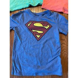 Includes three gently worn and washed t shirts- one egg collective 5t runs small, old navy orange vneck, and Superman old navy tshirt.