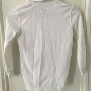 Size 8 white collared shirt for boys, elastic cuff on sleeves, gold emblem on left chest. Worn once for a costume.