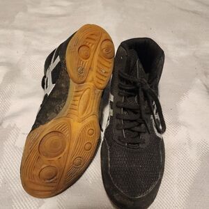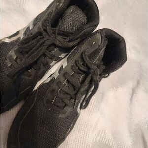 Comfy athletic like low high tops with mesh and cushion for breathable shoes. Black with White accents. Gently used. one quick scrub they will look like new.