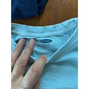 Boys T-shirt bundle- one is Old Navy size extra-large, navy blue and other is Old Navy light turquoise size extra large, some minor discoloration inside neck collar, has pocket, other is Old Navy size extra-large navy blue, last is H&M size extra small men’s regular fit brown color- all in good used condition