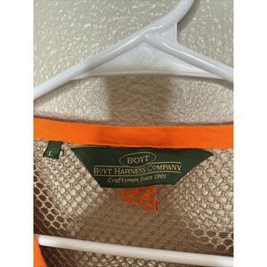 Boyt Hunting Shooting Vest Blaze Orange Men L Leather Shoulder Pockets MeshIn good condition. It has one small spot on the bottom back as shown in the pictures. Measurements in the pictures