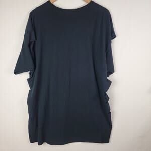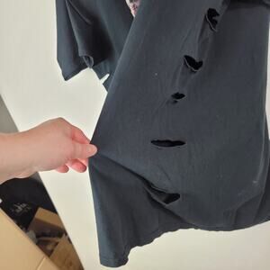 This is in distressed condition. There are bleach splatters and cuts up the sides as well as, cut on the sleeves. Please see photos.