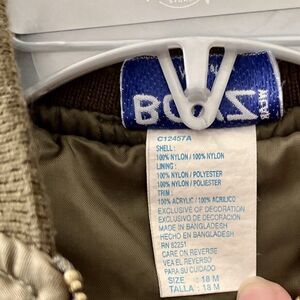Dress up your little one in this stylish Boyz Wear by Nannette Bomber Jacket! The jacket features a green satin outer shell with quilted accents and the iconic Top Gun logo. It has a full zip closure with zipped pockets for added convenience. The jacket is perfect for travel, activewear, parties, and casual outings. The unisex jacket is made of 100% nylon polyester and is insulated with polyester to keep your baby warm. The jacket is machine washable and easy to maintain. It is ideal for walking, playing, and costuming. The jacket is a size 18 months and is suitable for both baby boys and girls. Get your hands on this amazing jacket from Boyz Wear by Nannette and give your little one a stylish and comfortable look!