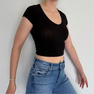 black ribbed, crop tee, stretchy cotton, fitted top, scoop neckline, minimalist fashion, Y2K style, layering piece, short sleeve, body-hugging