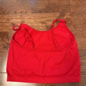 Bold scarlet ribbed top with thin straps. Ideal for everyday style.