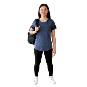 This Bozzolo women’s short sleeve tee is a versatile everyday piece with a vintage mineral wash design in a soft blue tone. The sporty double black stripe sleeve accents give it a retro-inspired athletic style.