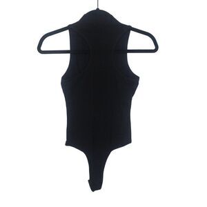 • One piece black body suit with deep cut arm holes in back