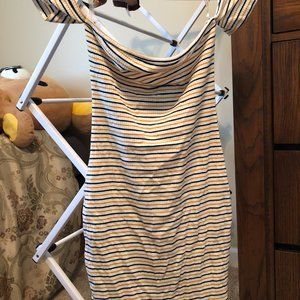 Yellow black and white striped dress, short and size: small. made with polyester and spandex. a thin dress.