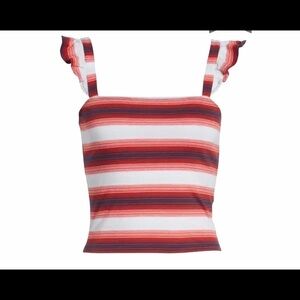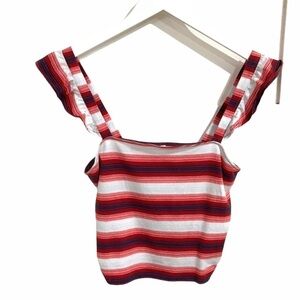 Red/white/blue stripe crop top Ruffled straps Square neckline Bust 30” unstretched laying flat Length 19”