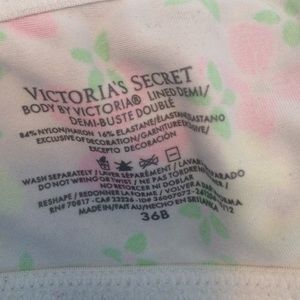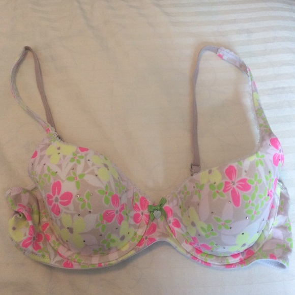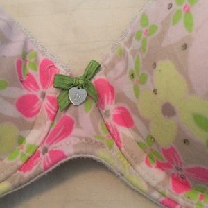 It is a beige bra with a flower pattern. The flowers are pink, yellow, green, and white.