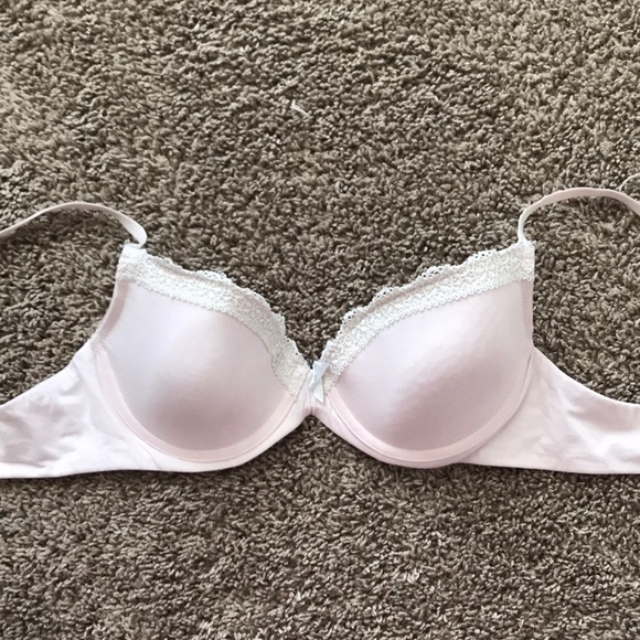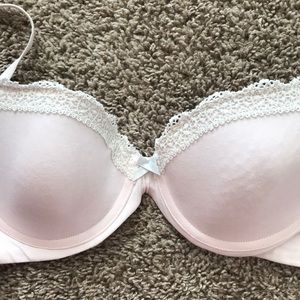 Light, pastel pink with white lace along the top. Wires are still good, nothing poking out.