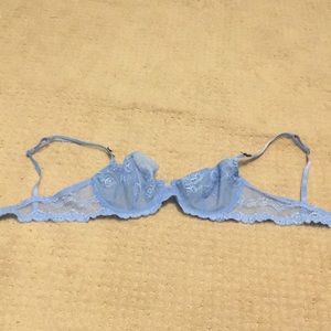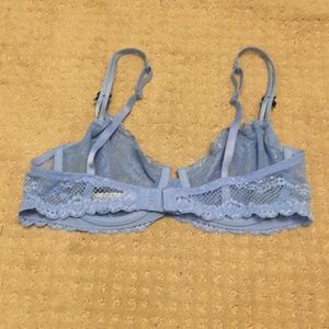 Periwinkle blue lace. Sheer, unlined, unpadded, supportive underwire. Adjustable straps, double hook-and-eye clasps with 3 size adjustments. Never worn