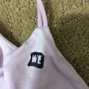 Pink stretchy bra. Crosses over cleavage. Super cute!